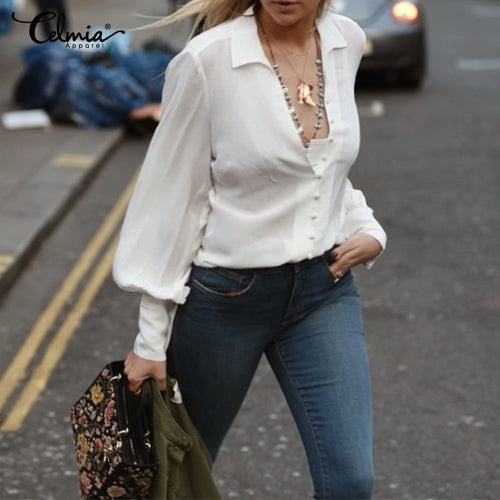 Plus Size Tunic Women's Blouse Celmia 2020 Autumn Long Lantern Sleeve Shirt Office Lady Blusas Casual Buttons Asymmetrical Tops